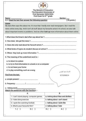 بالصور امتحان الشهر الاول لمادة اللغة الانجليزية للصف الثامن للصف الثامن الفصل الاول 2025